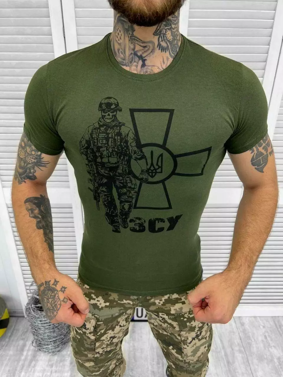 Футболка з принтом бавовняна олива (продаж ростовкою)