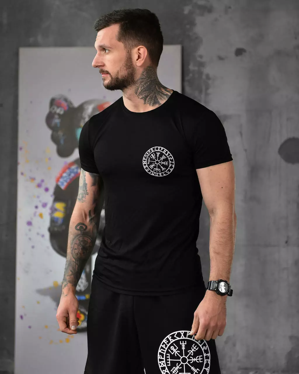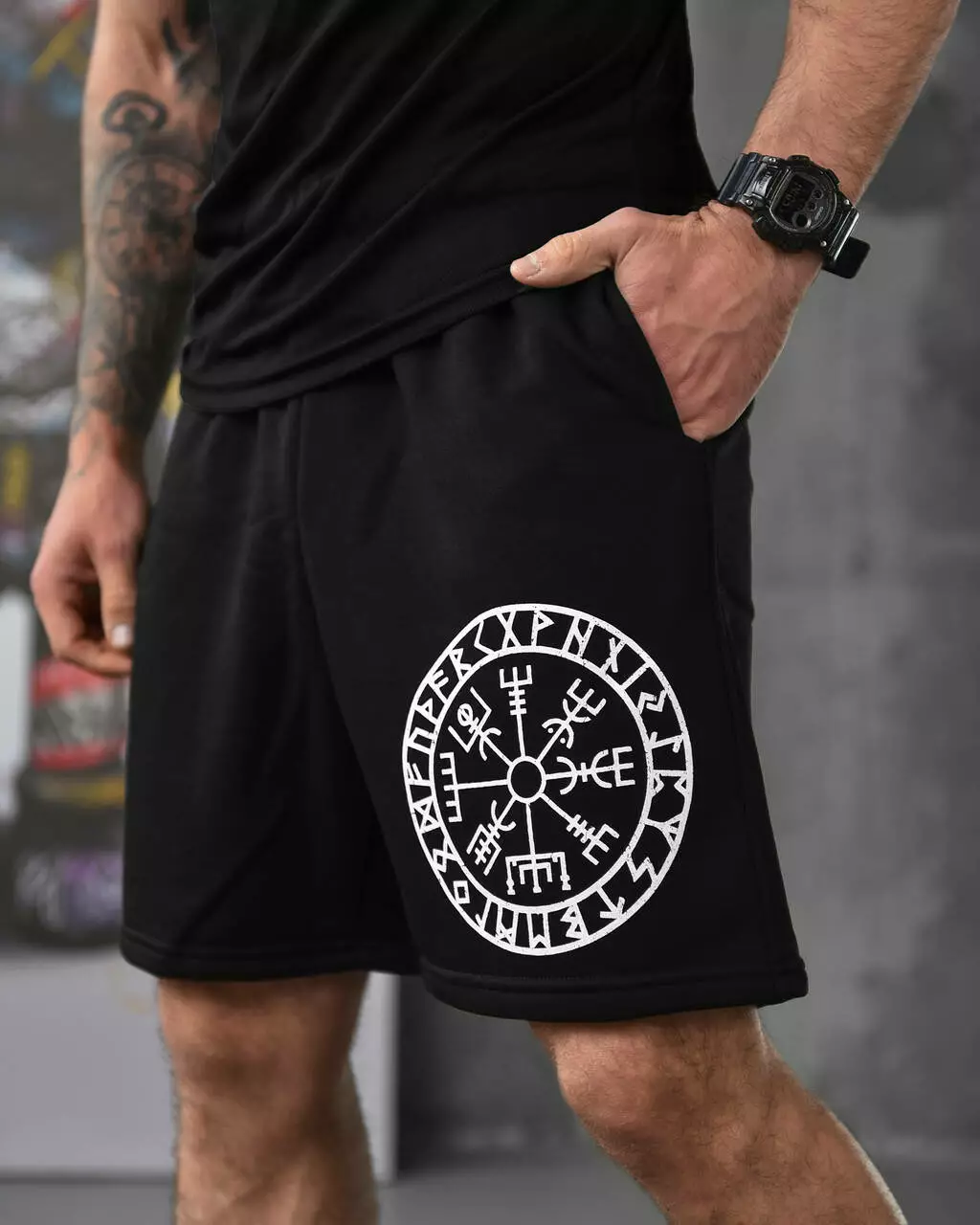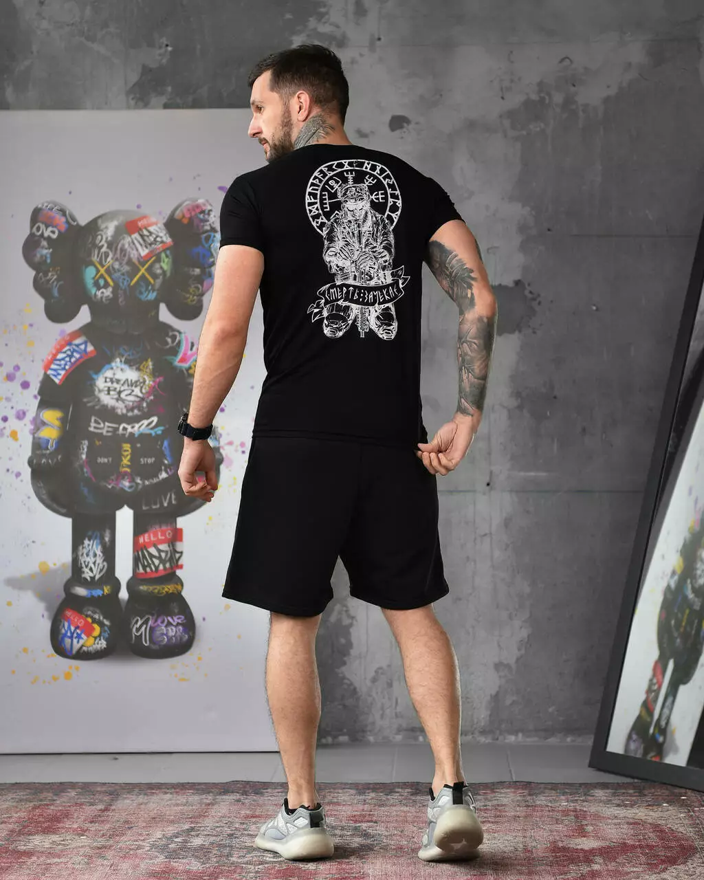 Підготуйтеся до літа з нашим стильним чоловічим комплектом, що містить комфортні шорти та футболку. Шорти виготовлені з легкого дихаючого матеріалу, який ідеально підходить для активного способу життя. У них зручний пояс на зав'язках для ідеальної посадки. Футболка виготовлена з поліестеру, що забезпечує еластичність і комфорт. Вона має стильний принт на грудях і чудово поєднується із шортами.
