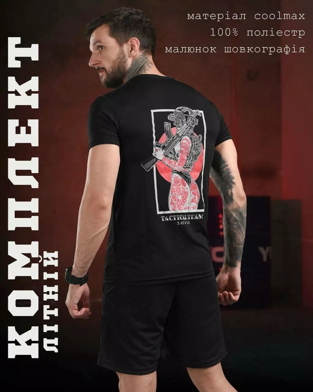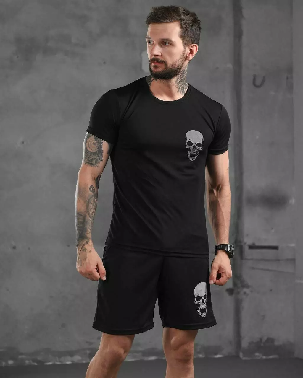 Підготуйтеся до літа з нашим стильним чоловічим комплектом, що містить комфортні шорти та футболку. Шорти виготовлені з легкого дихаючого матеріалу, який ідеально підходить для активного способу життя. У них зручний пояс на зав'язках для ідеальної посадки. Футболка виготовлена з поліестеру, що забезпечує еластичність і комфорт. Вона має стильний принт на грудях і чудово поєднується із шортами.