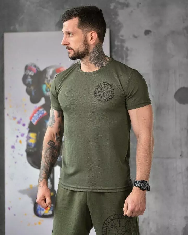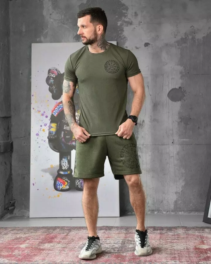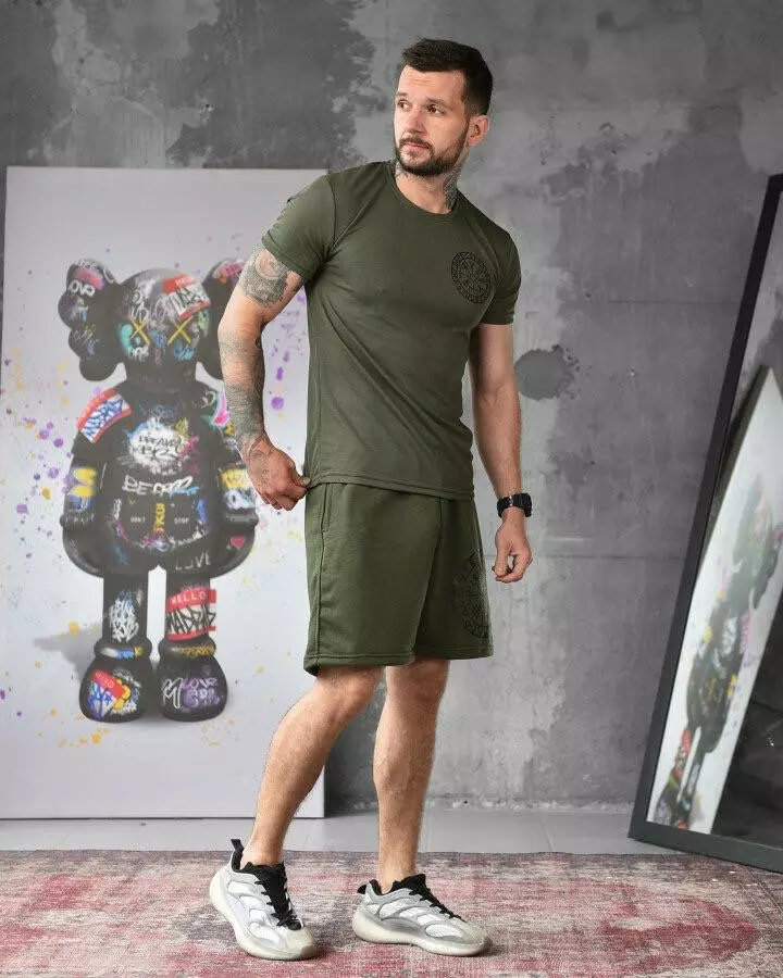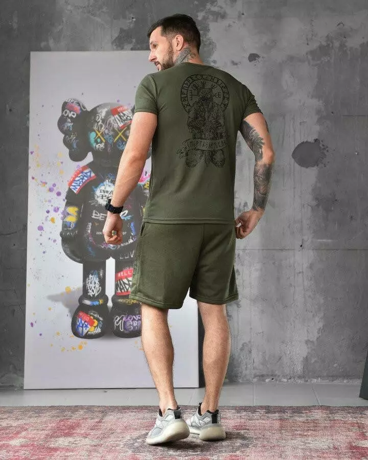 Підготуйтеся до літа з нашим стильним чоловічим комплектом, що включає комфортні шорти та футболку. Шорти виготовлені з легкого дихаючого матеріалу, що ідеально підходить для активного способу життя. Вони мають зручний пояс на зав'язках для ідеальної посадки. Футболка виконана з поліестеру, що забезпечує еластичність та комфорт. Вона має стильний принт на грудях і відмінно поєднується із шортами.