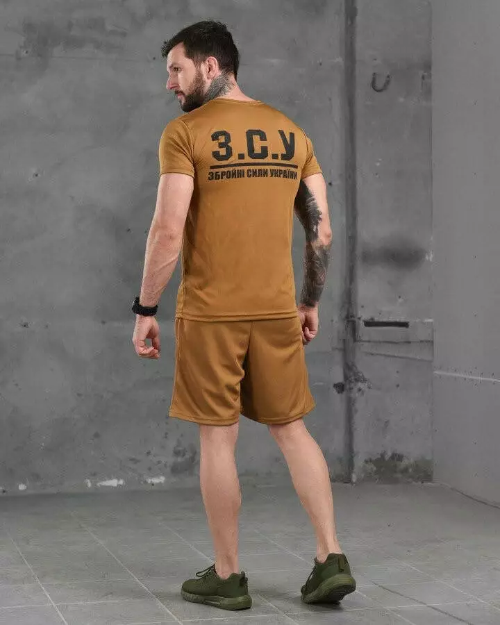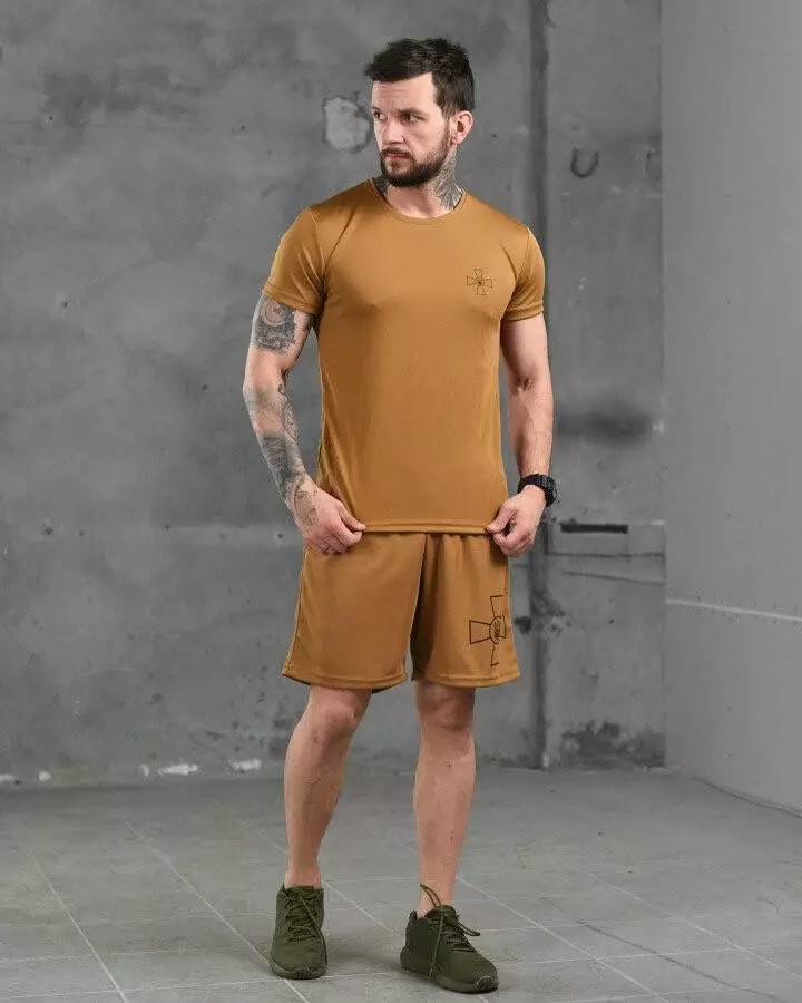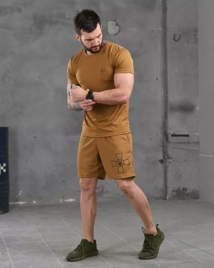 Підготуйтеся до літа з нашим стильним чоловічим комплектом, що містить комфортні шорти та футболку. Шорти виготовлені з легкого дихаючого матеріалу, який ідеально підходить для активного способу життя. У них зручний пояс на зав'язках для ідеальної посадки. Футболка виготовлена з поліестеру, що забезпечує еластичність і комфорт. Вона має стильний принт на грудях і чудово поєднується із шортами.