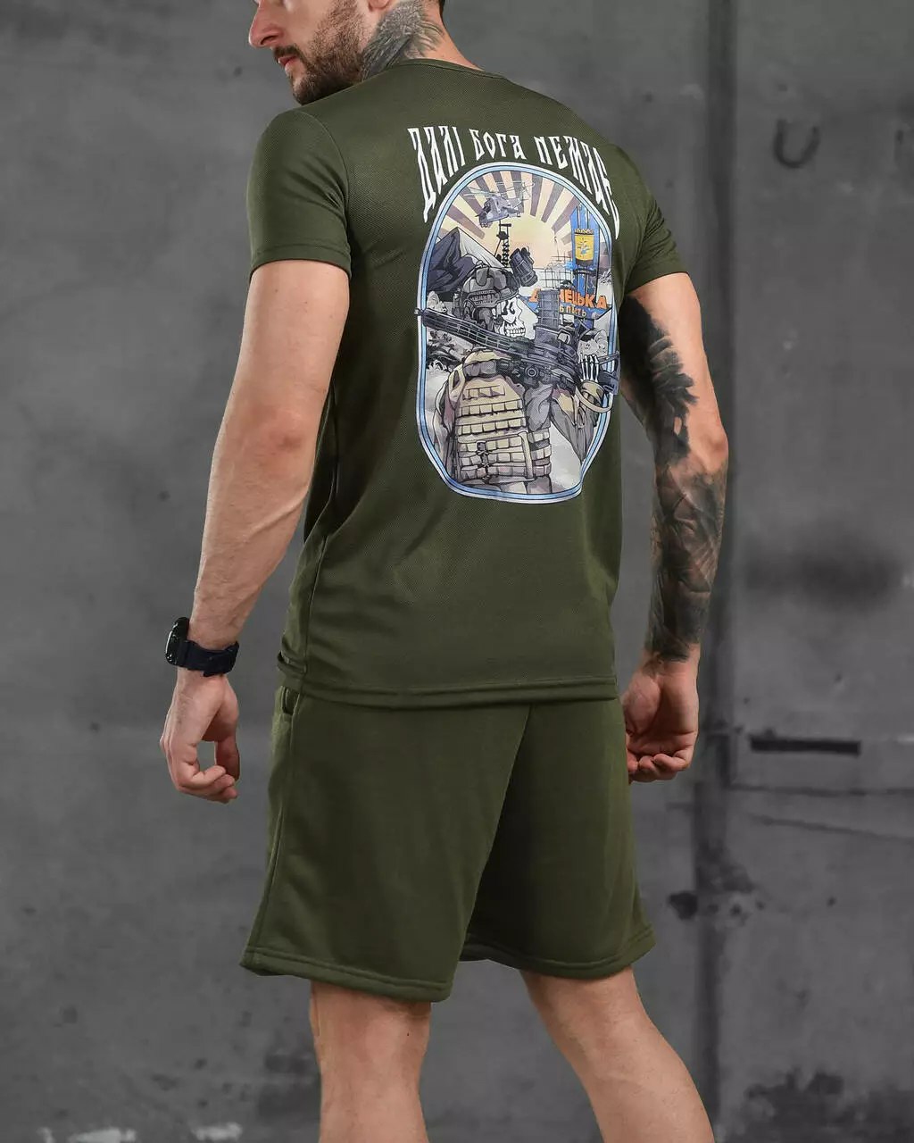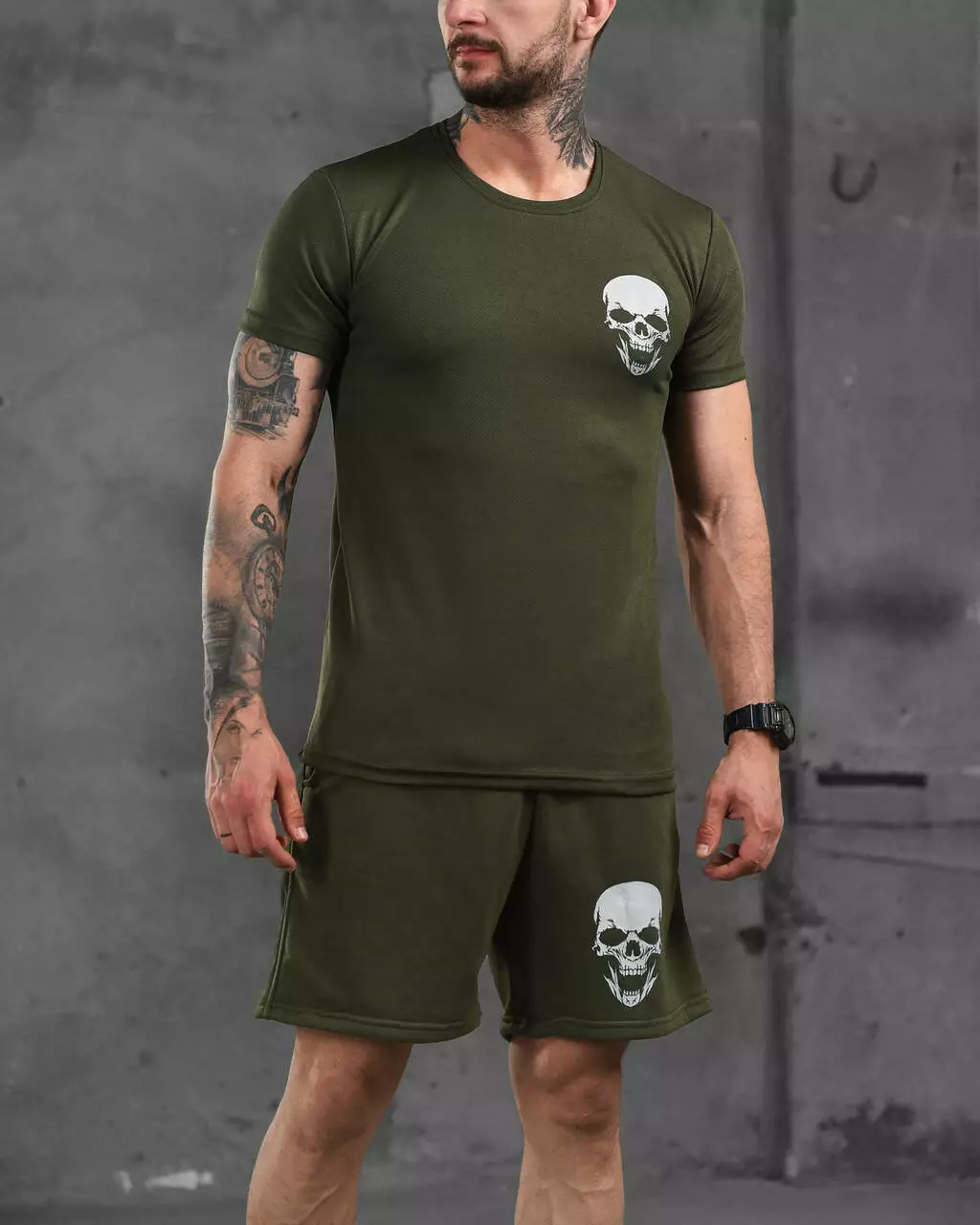 Підготуйтеся до літа з нашим стильним чоловічим комплектом, що містить комфортні шорти та футболку. Шорти виготовлені з легкого дихаючого матеріалу, який ідеально підходить для активного способу життя. У них зручний пояс на зав'язках для ідеальної посадки. Футболка виготовлена з поліестеру, що забезпечує еластичність і комфорт. Вона має стильний принт на грудях і чудово поєднується із шортами.